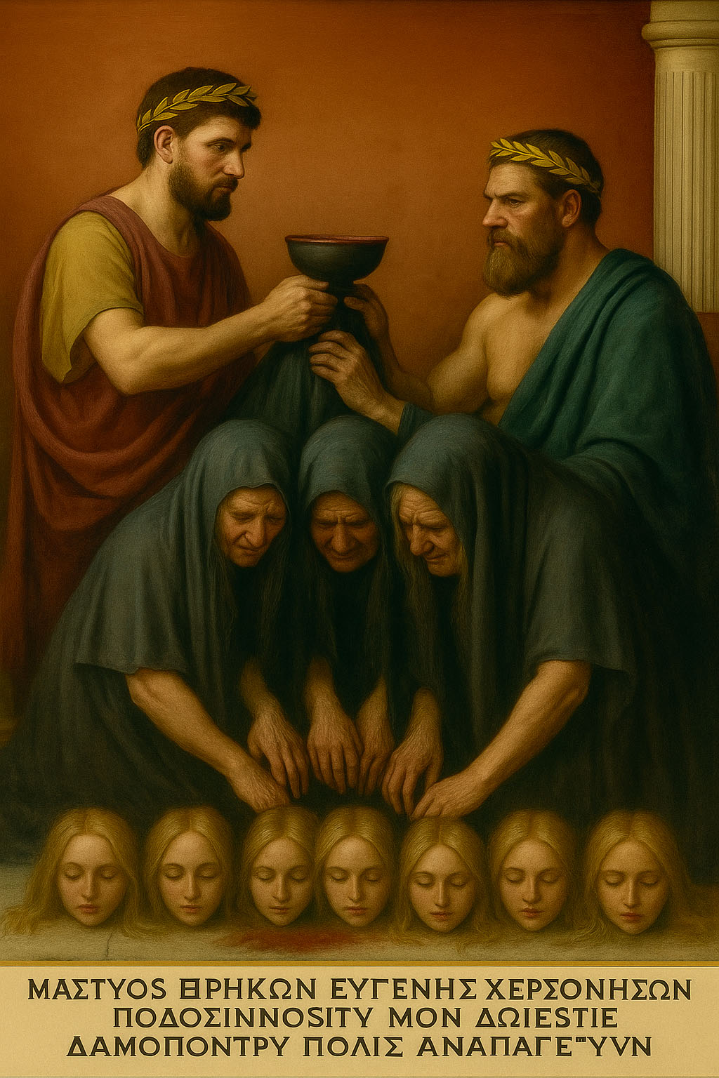 Он подстроил так, чтобы Демофонт задержался по неотложным правительственным делам; дочери же пришли в дом Мастусия. Слуги схватили девушек, зарезали и сцедили их кровь в кратер, смешав с вином. Когда Демофонт пришёл, наконец, на пир, Мастусий предложил ему чашу с вином, смешанным с кровью царских дочерей. Отец, не ведая, осушил чашу — торопился, видно, на пир и разгорячился — и поинтересовался, где дочери. «Ты же выпил кровь их, ха-ха!» — ответствовал Демофонт. Ну, или как-то по-другому посмеялся.