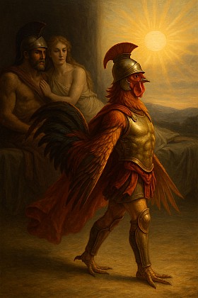 Но в какой-то из неудачных ночных визитов Алектрион под утро задремал и проспал восход солнца. Гелиос застал любовников, заложил их мужу Афродиты Гефесту, и всё это кончилось совершенно неудобоописываемым скандалом. Кое-как разделавшись с репутационными издержками (хотя какая там у Ареса репутация?..), Арес выместил ярость на Алектрионе: превратил его в петуха. Вместе с доспехами: поэтому у петухов на голове гребень, остатки шлема. Вообще-то Алектрион очень переживал свою промашку, потому что был действительно предан своему другу, так что уже и петухом каждый день на заре продолжает сообщать всему свету, что Гелиос въезжает на небо.