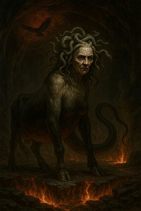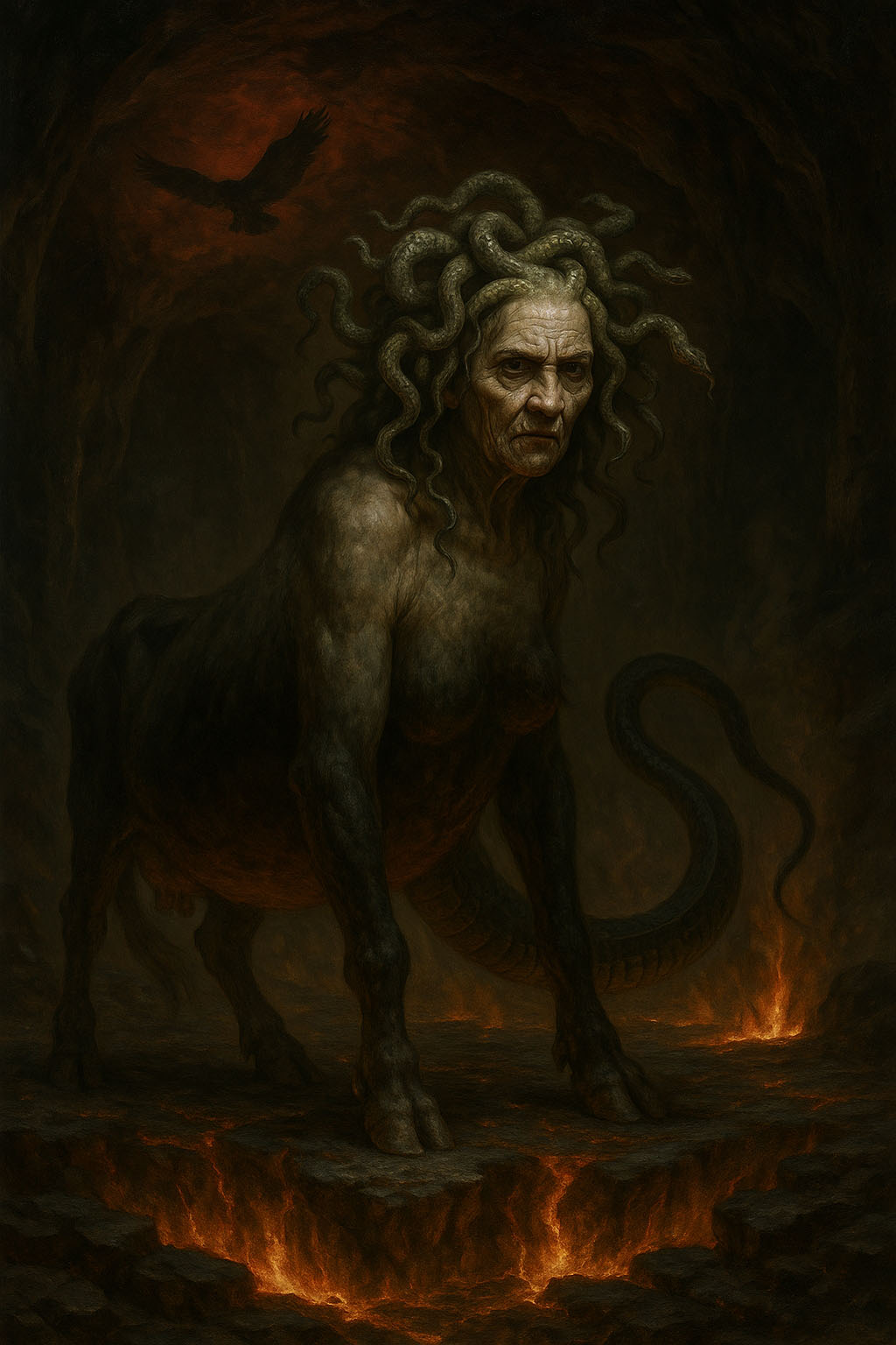Кампа тоже древнейшая нимфа, рожденная из тех же капель, но как она не похожа не гамадриад! Она «нимфа Тартара» — безысходно мрачного мира, мира подземного, мира еще более глубокого, чем Аид, таящего самые корни земли и сущего. Тартарианская Кампа обладала женским телом с 50 змеями вместо головы (или на голове), или бычьим телом и змеиными хвостами (как вариант, со скоропионьим). Ничего миловидного и нимфеточного в ней я не нахожу.